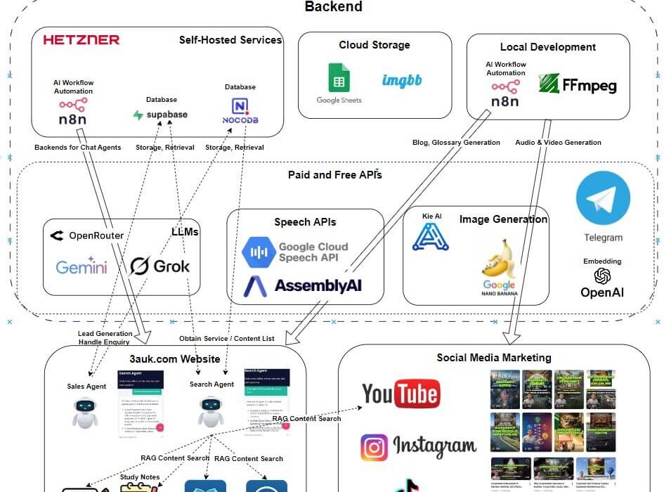 An end-to-end system for generating, organizing, and delivering educational content using modern AI tools — covering text, images, audio, and video production, alongside intelligent assistants for content retrieval and lead capture.