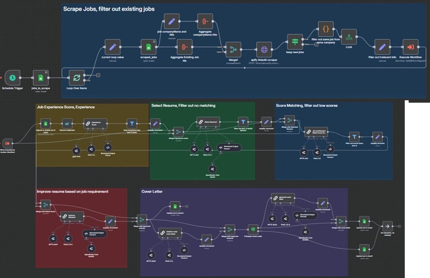 A fully automated job discovery and application management system built using n8n, Apify APIs, Google Sheets, and LLM-based evaluation workflows.